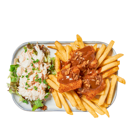 Frietjes met een topping van Southern fried kiphaasjes, peper mayonaise saus sla en coleslaw
