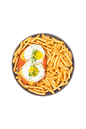 Frites, sla, coleslaw, schnitzel, cheddar en 2 eieren